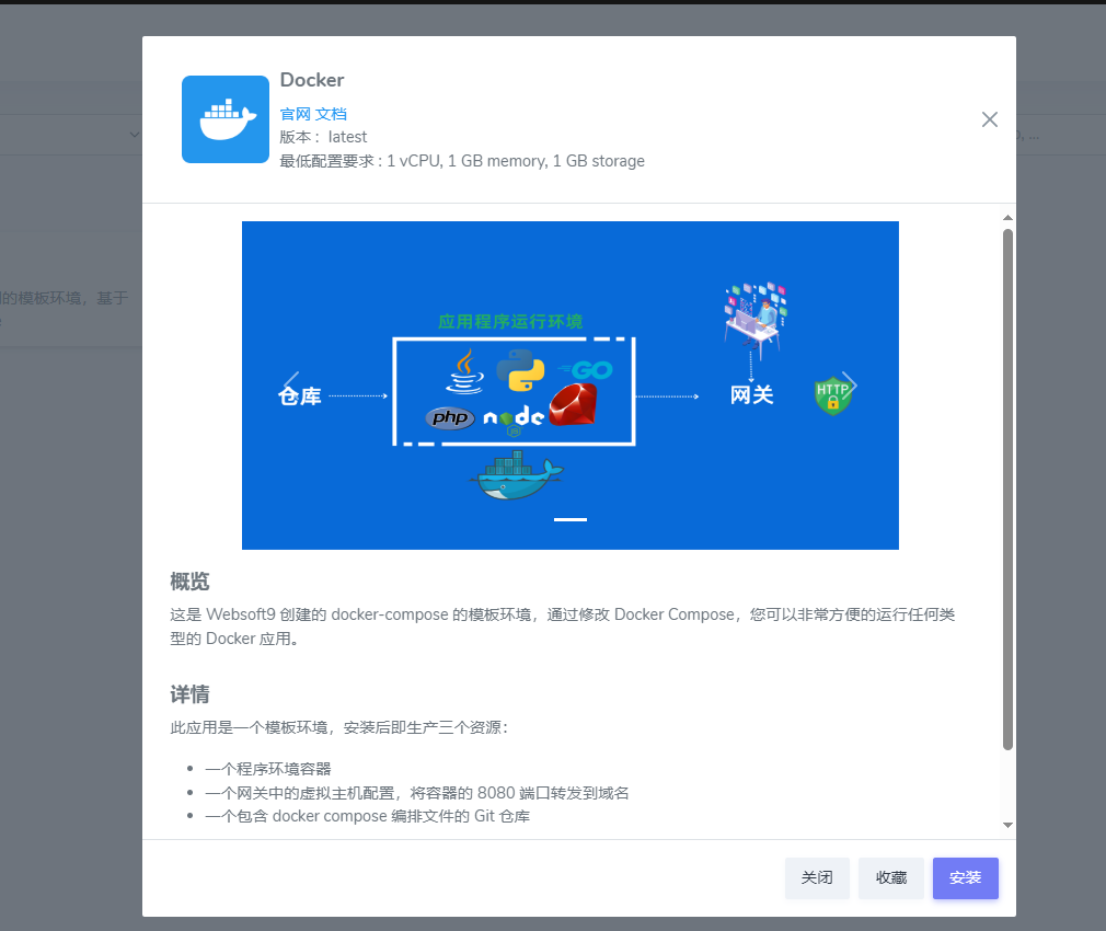 Websoft9 应用商店 中进入 "运行环境" 下的 "Docker" 子类
