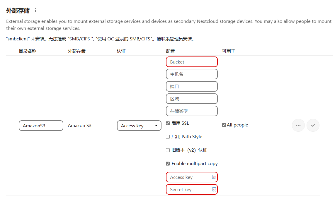 Nextcloud 后台的 管理设置 中设置外部存储,S3 兼容协议设置范例: