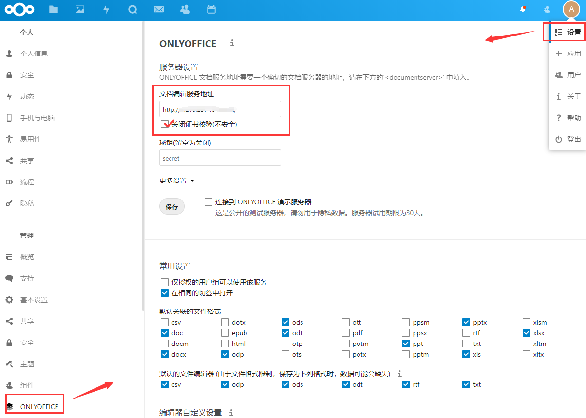 安装完成后,找到设置页面,对 ONLYOFFICE 进行如图所示的设置(参考官方文档)