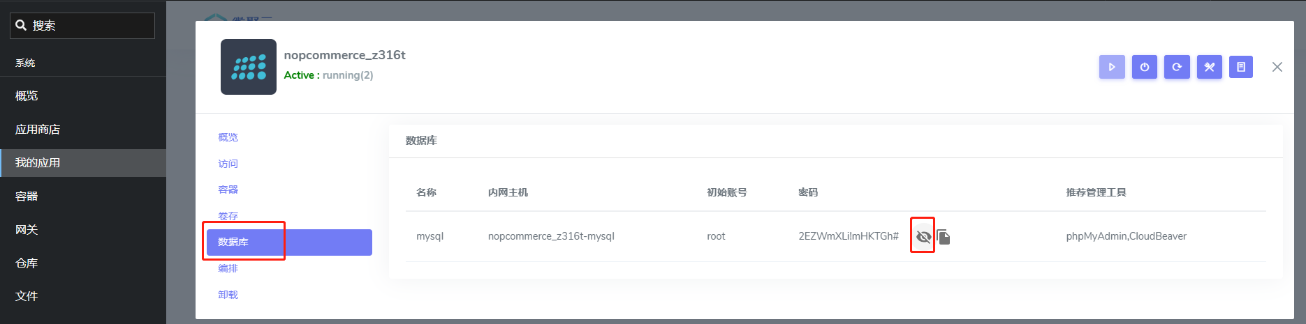 Websoft9 控制台 安装 nopCommerce 后,通过 "我的应用" 查看应用详情