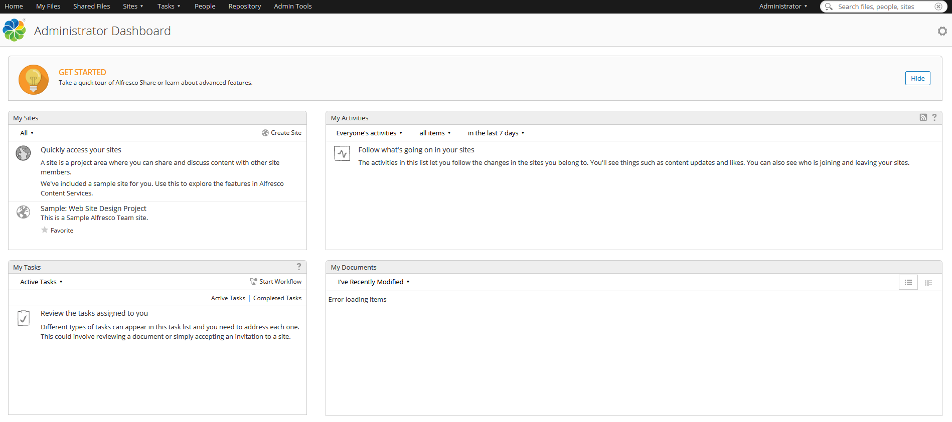 - Change password: In the Alfresco backend, go to the top right corner: Administrator > My Profile