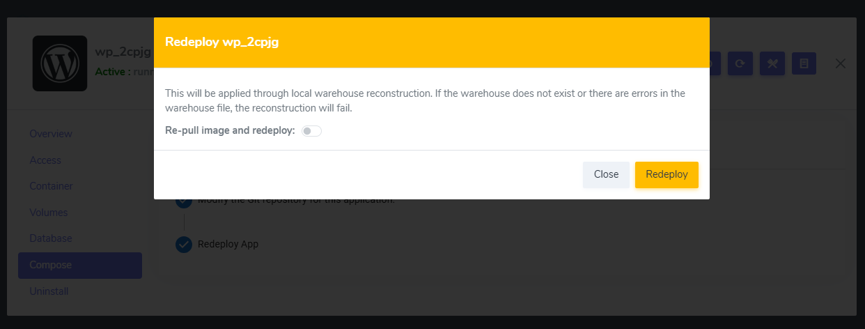 Redeploy application is a critical Websoft9 operation designed to Update your deployment for your customized configs or continuous deployment while retain data.
